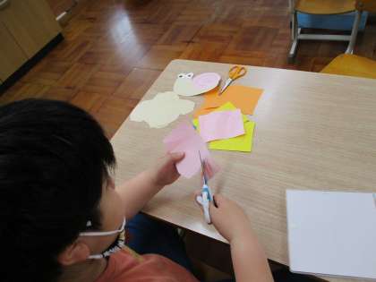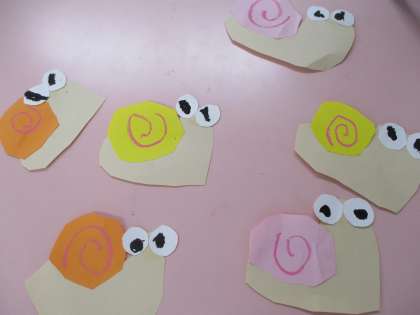 図画工作科の時間にカタツムリの飾りを作りました。画用紙でカタツムリの体や殻、目などを作り、パスで模様を描きました。