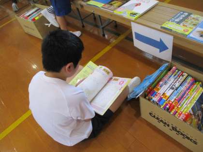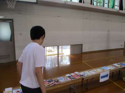体育館で選書会がありました。学校図書館に置いてほしいと思う1冊を選びました。都道府県の本やスポーツの本、食べ物の本など自分の好きな1冊を見つけて選ぶことができました。
