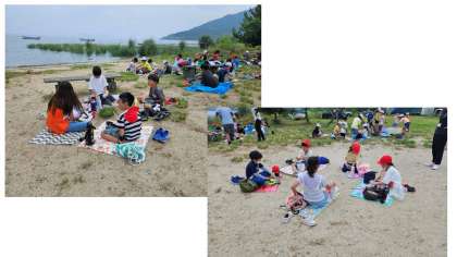 びわ湖青少年の家に到着。湖畔でお弁当を食べました。