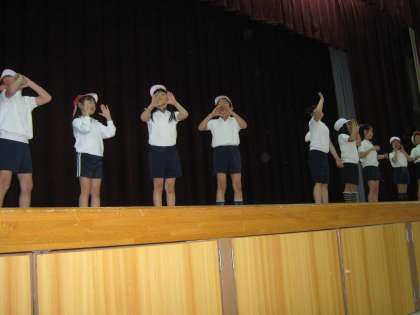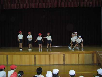 今週から体育ではリズムダンスが始まりました。今日は「まるまるもりもり」のダンスを班ごとにアレンジして、オリジナルダンスをステージで発表しました!!子どもたちは「エグザイル」のまねをしたり、踊りながら並び方を変化させたりと、いろいろな工夫を加えてダンスを楽しんでいます。