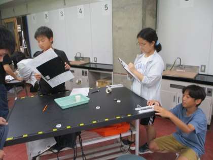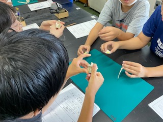 1組は地学分野の化石について、2組は物理分野の衝突についての学習をしました。
