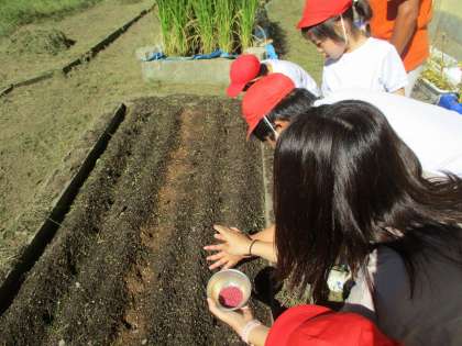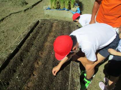 地域の方にお世話になり、今年も大根の種まきをしました。1か所に3粒ずつ丁寧に種をまきました。3日ほどで芽が出るそうです。