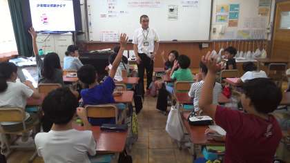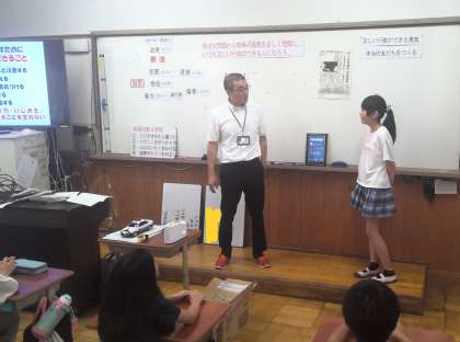 山科警察署の方に来ていただき、社会のルールやきまりについてお話していただきました。「自分がされたら傷つかないか」「大切なひとをがっかりさせないか」など、自分の行動の判断基準になることも教えていただきました。今日学習したことを忘れずに、学校生活を送っていきたいです。