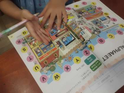 1回目の学習では、絵の中に隠されたアルファベット(大文字)を見つけ、みんなで発音してみました。学習の中で、「私の服にもアルファベットの〇〇があった!」と見つけている子もいました。