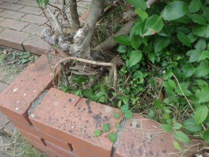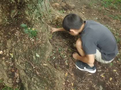 校内で「ここに何かが住んでいそう」と思うような場所を探し、校庭に落ちているもので飾ります。「入り口の門を作ったよ。」「寝られるベッドを作ったよ。」などと、想像力を働かせて、個性豊かな「すみか」を作っていました。