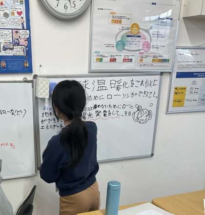 ローソンでは、レジを使って販売や接客の練習をしたり、アバターレジの体験をしました。また、企業として行うことのできるSDGsへの取り組みをグループで話し合いました。