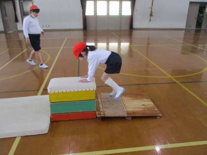 体育でとび箱運動をしました。今日はまたぎのり・またぎおり、開脚跳びに挑戦しました。勢いを付けて踏み切ることや手を付く位置などを意識して跳びました。準備や片付けもみんなで協力して行えました。