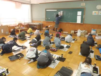 これまでは机の上で書いていたので、膝をついて書くとなると、姿勢や力の入れ方などで少し苦戦する様子が見られました。慣れてくると力強い字が書けるようになり、できあがった作品を見て「いい字が書けた。」と満足そうにしていました。