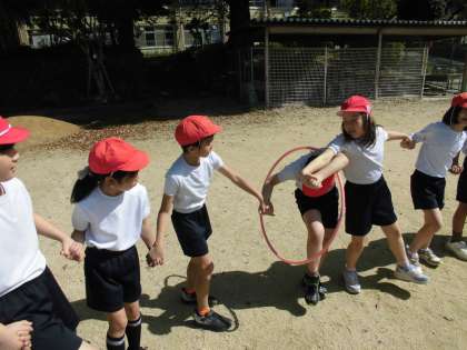 今日はフラフープを使ってチーム対抗のフープリレーを行いました。子どもたちは、どうしたらうまくつながるかを考えながら活動していました。友達と協力して、難しいこともチャレンジしていけるといいですね。