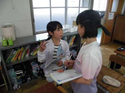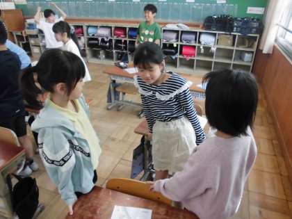 今回の外国語活動では、子どもたちどうしで交流して、友達の好きなものを外国語で尋ねあう活動をしました。相手のことを知るために、相手の目を見たり、笑顔で会話したり、ジェスチャーを使ったりと工夫している姿が見られました。どんな時も相手に伝えようとする気持ちがとても大切だなと感じました。