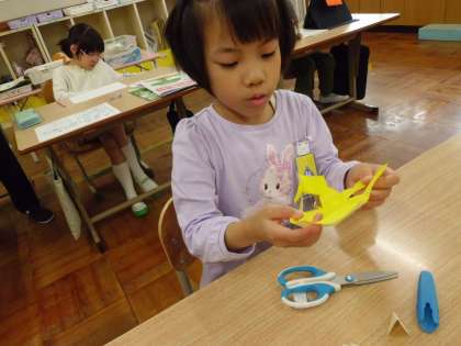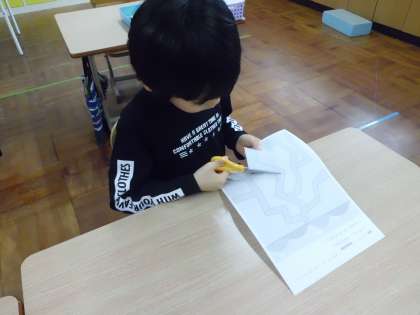 1年生の子どもたちは、図画工作科の学習で、はさみを使った工作に取り組みました。小学校で初めてのはさみを使った学習に、子どもたちは安全に気をつけながら、集中して取り組みました。完成すると、「きれいだね。」、「むらさきとピンクだよ。」とお互いの作品を見あっていました。