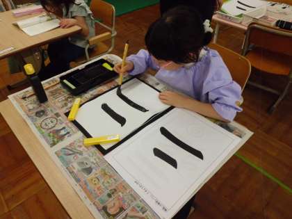 3年生は書写の学習で漢字の「二」を書きました。3年生から始まった毛筆を使って納得のいく字が書けました。