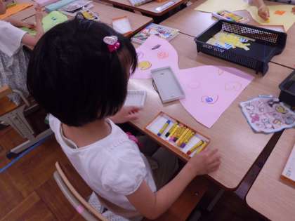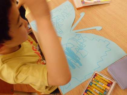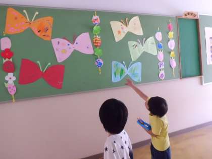 図画工作科の学習で季節のかざりを作っています。春になって「ちょうちょがいるよ。」、「モンシロチョウだ。」と子どもたちが見つけていた蝶を色画用紙で作りました。線に合わせて切ったり、模様を考えて色を塗ったりして作りました。出来上がった掲示板を見て子どもたちは嬉しそうでした。