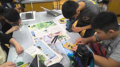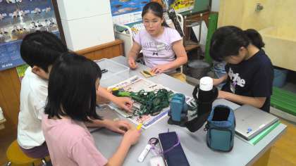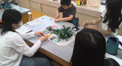根から取り入れた水は、植物の体のどこを通って、全体に行き渡るのかを考えました。色水を吸収した植物を、カッターナイフで切り取って、切り口の様子を観察しました。