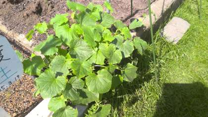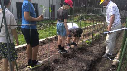 みんな、キュウリの苗の下のほうを指でしっかり挟み、