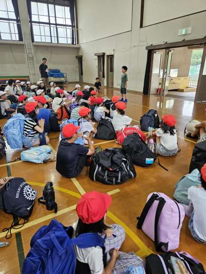 少し曇り空ですが、今日から1泊2日の宿泊学習です。全員、元気に登校し、体育館で出発式を行いました。