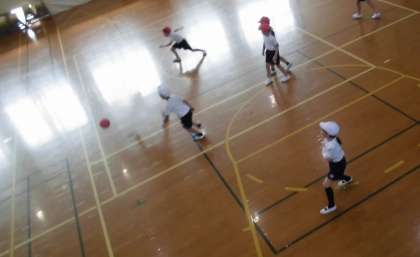 体育の学習でエンドボールをしています。学習の回数を重ねるごとに、ボールをキャッチしたり、パスしたりできる児童が増えてきました。