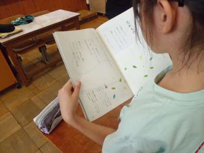 「忘れ物」「ぼくは川」の二つの詩を読んで、擬人法や体言止めのおもしろさなどを話し合いました。