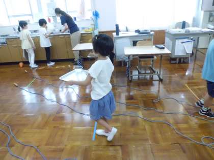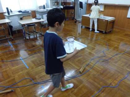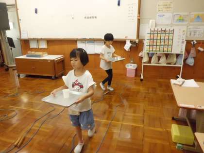 自立活動の学習では、お盆にのせた水をゴールまでこぼさずに運ぶことで、周りの状況を読み取りながら、持っているお盆にも集中をするという学習をしました。子どもたちはゴールできると、「できたできた。」と嬉しそうでした。