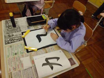 3年生は書写の学習で「力」を書きました。毛筆の使い方にも慣れてきて、しっかりと字を書くことができていました。