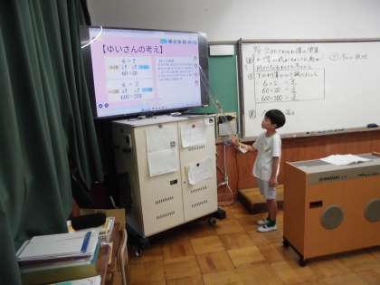 今回は、割り算の性質を使って、3つの式の商が同じになるわけを考え、説明する活動を行いました。既習内容から考えている姿があり、子どもたちも振り返りながら学習を進めている様子でした。