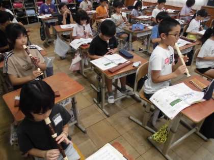 今日は、夏休みの間に練習していた「陽気な船長」をリコーダーで吹きました。音を短く切ったり、低いレの音をやさしい息で吹くことができるように意識したりして練習していきました。