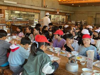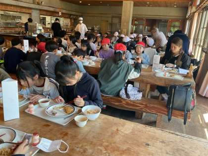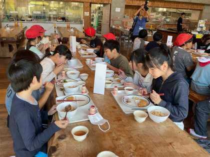 昼食を食べています。バイキング形式なので、みんな楽しく取っています。