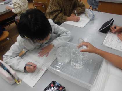 空気を冷やしたり温めたりすると、体積はどうなるのかを考えながら実験をしていく活動を行いました。実際には目では見えないけれども、空気の体積が大きくなっていることについて知り、驚いている様子でした。