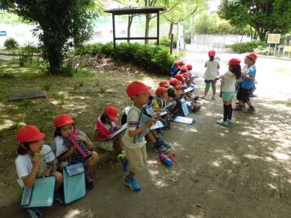 6月3日(火)に,生活科の学習で山階校区の町たんけんに行きました。先日は外環状線を通って校区の東側に行き,たくさんのお店や施設を見つけました。今回は校区の西側に行きました。暑い中でしたが,子どもたちは興味津々で様々なお店や施設を見つけてメモしていました。途中で休憩のために寄った中央公園の木陰はとても気持ちがよかったです。これから,子どもたちといっしょに2年1組のオリジナル校区地図を作っていく予定です。