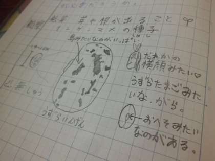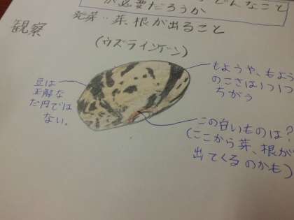 “植物の発芽”という新しい単元に入り、子ども達は一人ずつに配られたインゲン豆の種を熱心に観察し、記録していました。