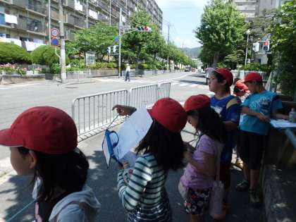 25日の月曜日は北コースのグループが探検に行きました。外環状線から山科駅に向かって,病院や歴史的なもの,スーパーマーケットや大学など,学校から見て北のコースにもたくさんの発見がありました。暑い中、子どもたちはコースにぴったりの名前を考えながら探検することができました。