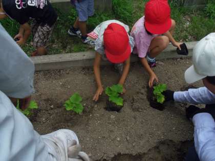 2年 きゅうりの苗を植えました。