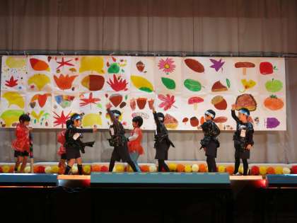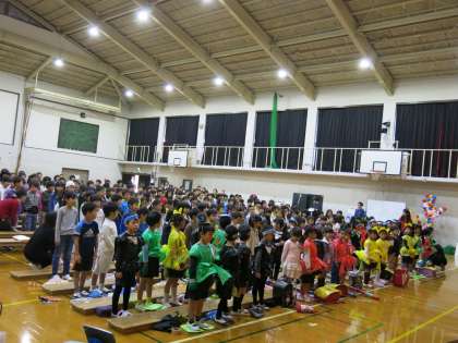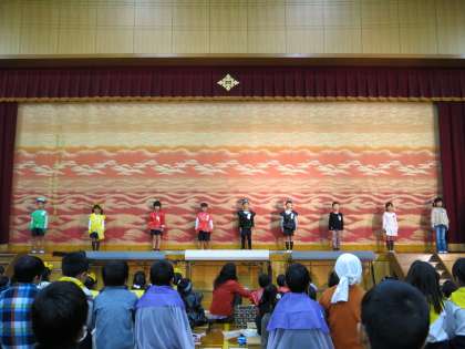 はじめのことばに全校みんなでの詩の群読と合唱で