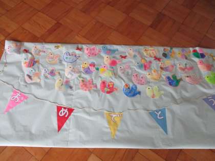 出来上がった鳥さんをおめでとうフラッグの上に散らばらせ完成です。