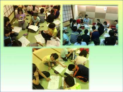 1日目午後9時20分。今日1日で学習したことについて、グループで振り返りをしました。そしてリーダーは、明日の行動について確認をしました。今日は本当にたくさんのことを経験して学習しました。明日に備えて、ゆっくり体を休めます。おやすみなさい。