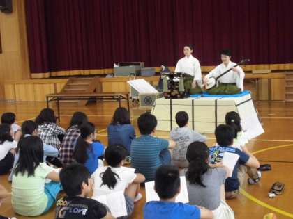 人形遣いの方から聞く人形についての説明は、とても面白く奥が深い人形浄瑠璃の世界に6年生全体が引き込まれていました。