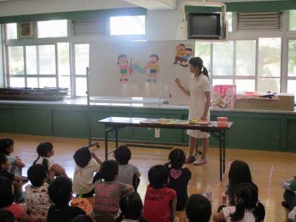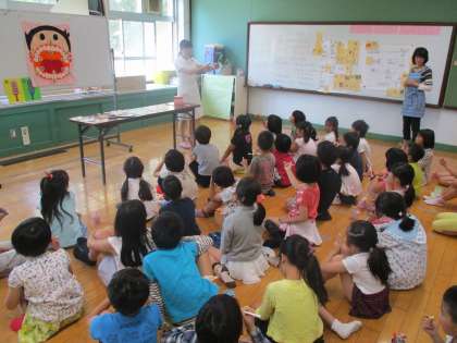 今日は,二時間目に歯科衛生士の方が来られ,子どもたちに歯磨き指導をしていただきました。絵や模型などを用いて,わかりやすく説明していただきました。昼食後,子どもたちも進んで歯磨きに取り組んでいました。