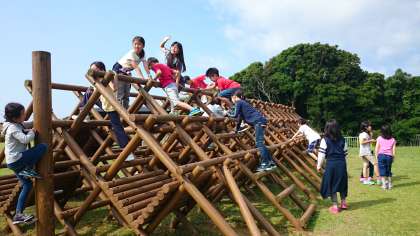 朝食の後、芝生広場で遊びました。芝生広場の船のところでの写真撮影は、定番です。