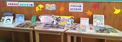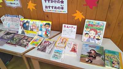 来週から始まる読書週間に向けて、すずかけの会の方や図書委員会の児童が、玄関ホールでおすすめの本を展示しています。