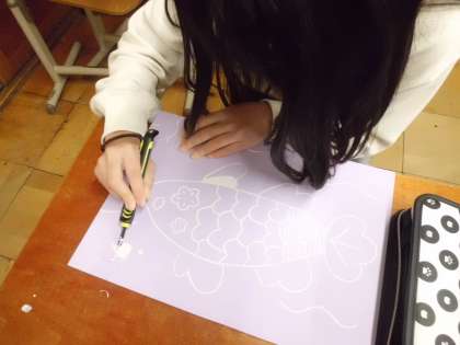 「幻の魚」というテーマで、安全に気をつけて彫り進めています。