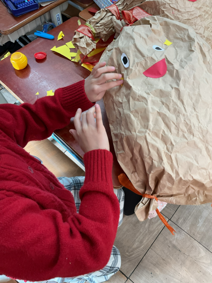 図画工作科では「くしゃくしゃっぎゅっ」を学習しました。「しばったり、ねじったりすることで自分の友達を作ろう!」と大きな紙袋をくしゃくしゃにし、リボンや紙テープなどを使って、一人一人が作り上げていました。
