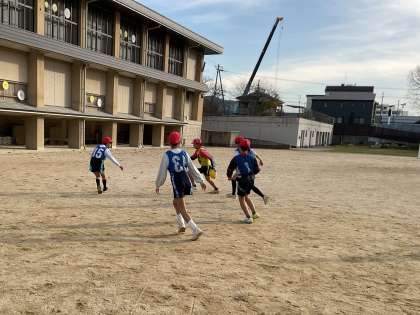 2学期最後のタグラグビーでした。相手の動きを予測して、タグを取ったりディフェンスを工夫したりしました。