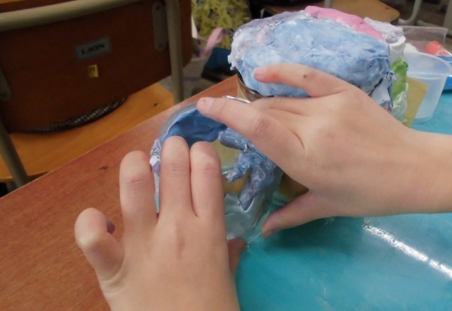子どもたちは「絵の具を混ぜて、綺麗な色が作れたよ」や「紙粘土を容器に貼り付けて、貯金箱を作ろう」など、楽しみながら学習を進めています。