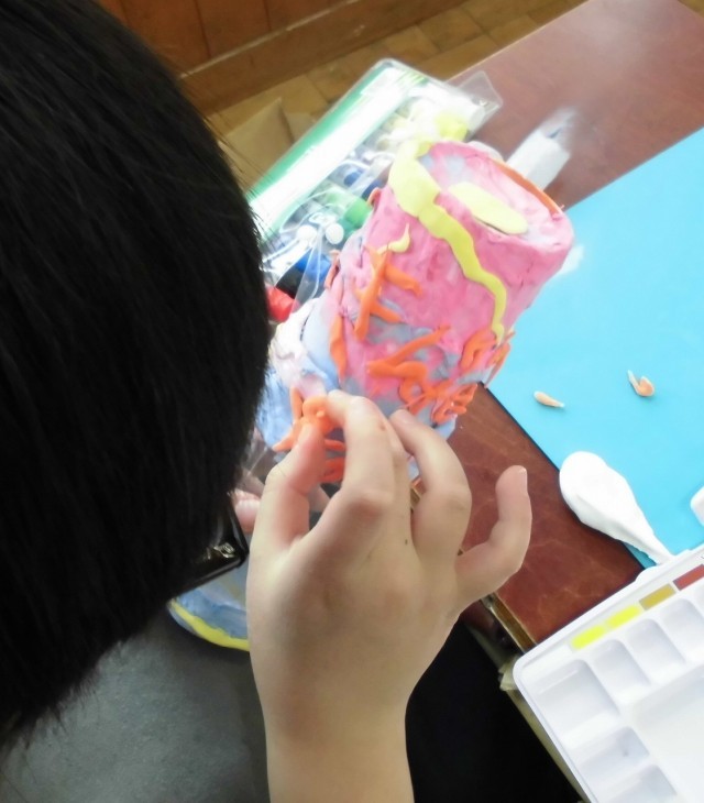 紙粘土に絵の具を混ぜて、カラフルな色を作り、空き容器に貼り付けています。