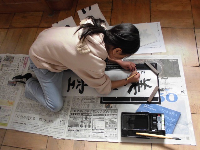 今回の書写では、画仙紙を使って「美しい空」という言葉を丁寧に書いていきました。いつもよりも長い紙を使って書くので、床に新聞紙を敷いて書きました。いつもとは違った書き方でしたが、一筆一筆集中しながら書くことができていました。
