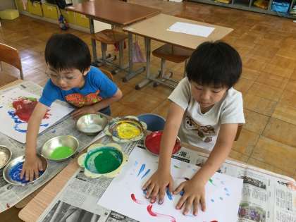 いつもは筆やクレパスなどを使って描きますが,今日は手や,指を使って絵を描きました。とろとろの絵具を使って思い思いの模様や風景を描きました。