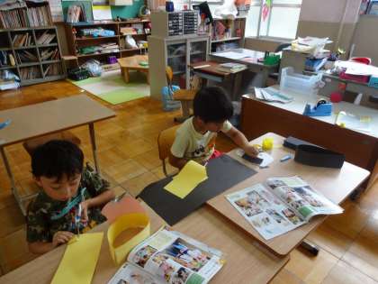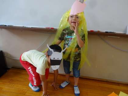 わっかをかぶって変身したいものに変身しました。飾りをつけてみたり,髪の毛を張り付けてみたり…。「牛」と「プリンセス」に変身できました。