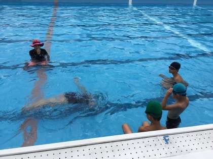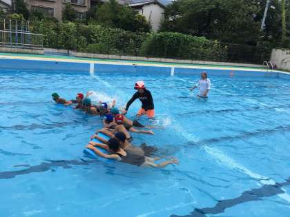 安祥寺中学校ブロックの西野小学校・山階小学校・安祥寺中学校の三校が集まって山階小学校でみずあそび・水泳学習をしました。一緒に水を掛け合ったり,バタ足競争をしたり,楽しく学習しました。