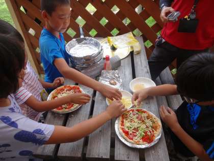 そとにでて生地に盛り付けをしていきました。トマトにピーマン・ウインナー・万願寺とうがらし。そして最後にたっぷりのチーズをかけて火にかけて焼いていきます。
