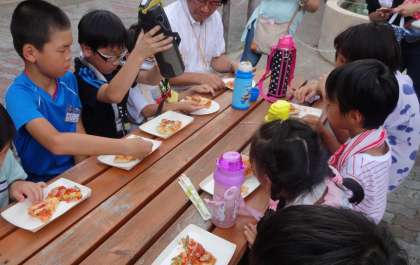 焼きあがったピザを囲んで,みんなで「いただきま〜す!」。「おいし〜い」とみんなモリモリ食べていました。